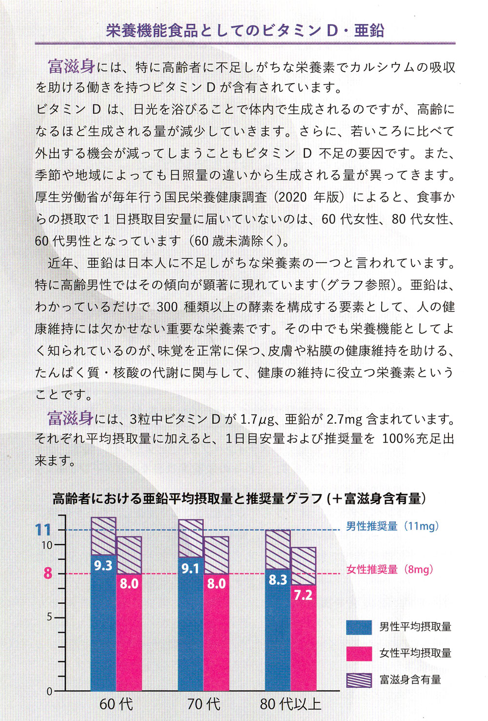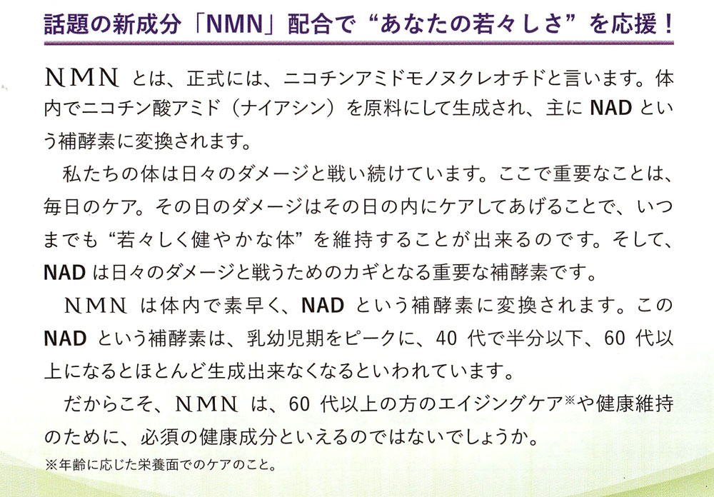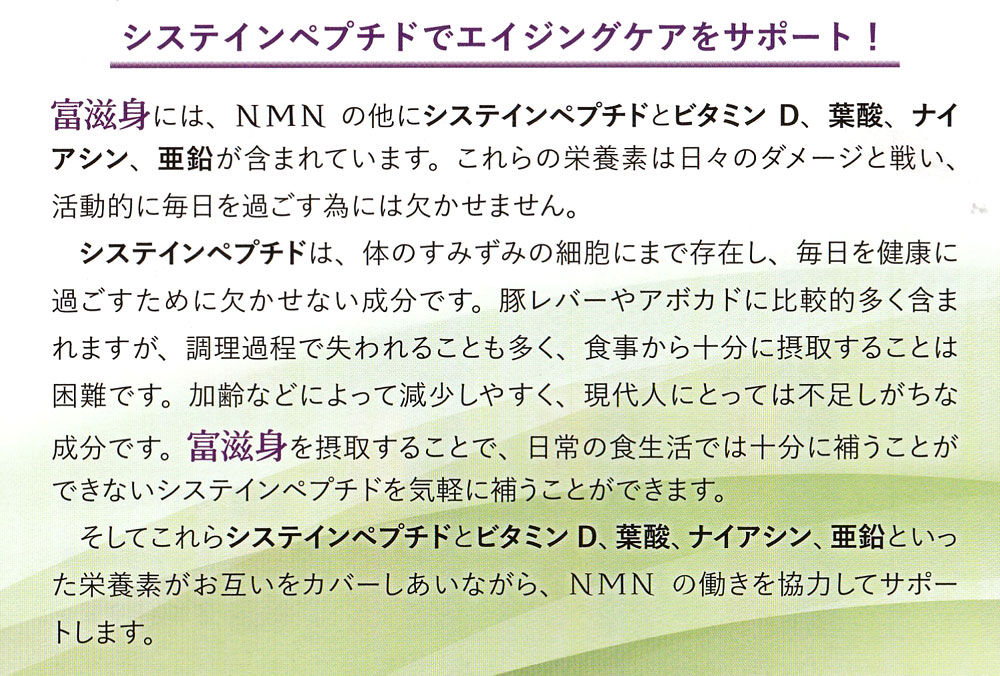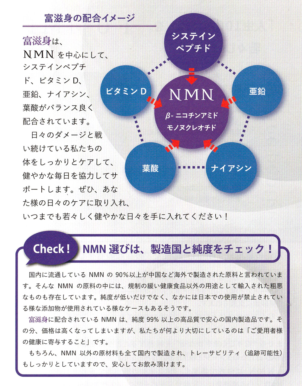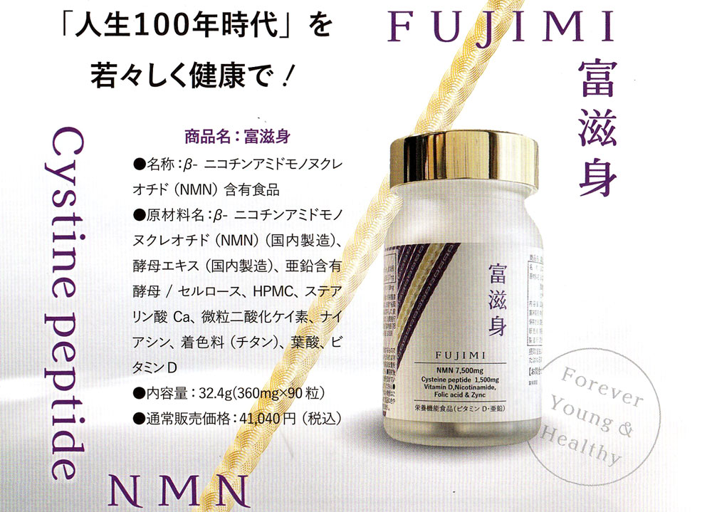 お勧め商品 商品 富滋身 投稿日:2025年10月8日 更新日:2025年10月14日 富滋身 (fjm001) 名称β-ニコチンアミドモノヌクレオチド(NMN)含有食品原材料NMN(β-ニコチンアミドモノヌクレオチド)(国内製造) 酵母エキス(国内製造) 亜鉛含有酵母(国内製造) セルロース、HPMC、ステアリン酸Ca、微粒二酸化ケイ素、 ナイアシン、着色料(チタン)、葉酸、ビタミンD内容量32.4g(360mg×90粒)お召し上り1日3粒を目安に水またはぬるま湯などでお召し上がりください。 定価(税別) ¥38,000販売価格(税別) ¥38,000 在庫状態 : 在庫有り 数量 主な栄養成分表示 3粒(1,080mg)当たり エネルギー 3.8kcal たんぱく質 0.32g 脂質 0.02g 炭水化物 0.59g 食塩相当量 0.012g ナイアシン 3.9mg 葉酸 72μg ビタミンD 1.7μg 亜鉛 2.7μg 7 -お勧め商品, 商品
